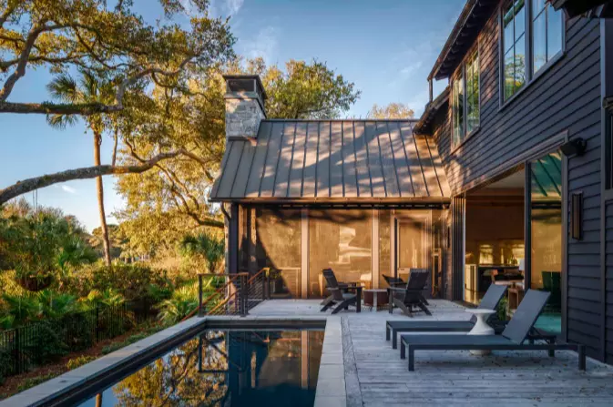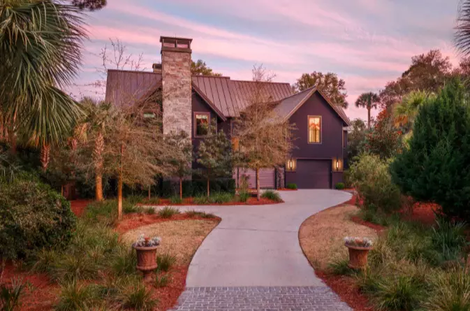 Set within Kiawah Island’s sought-after Ocean Park community, Oak House offers modern coastal living surrounded by lagoon views and native Lowcountry landscape. The property’s main house and guesthouse lie amid native trees, creating a sense of privacy and connection to nature. Built in 2023, the home features an airy, open layout with floor-to-ceiling glass, wide-plank flooring and vaulted ceilings that draw natural light into every room.