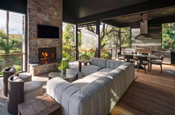 Designed for effortless entertaining, the main living spaces open to a private outdoor oasis with a heated saltwater pool and spa, firepit lounge, outdoor fireplace and a full summer kitchen. Picture yourself beginning the day with coffee overlooking the lagoon or ending evenings gathered around the fire as the sun sets through the oaks. Inside, the chef’s kitchen features a waterfall island, Sub-Zero and Wolf appliances, a butler’s pantry and a seamless flow to the dining and living areas. The serene primary suite opens directly to the pool, while additional guest suites and a separate studio space provide space and comfort for hosting.