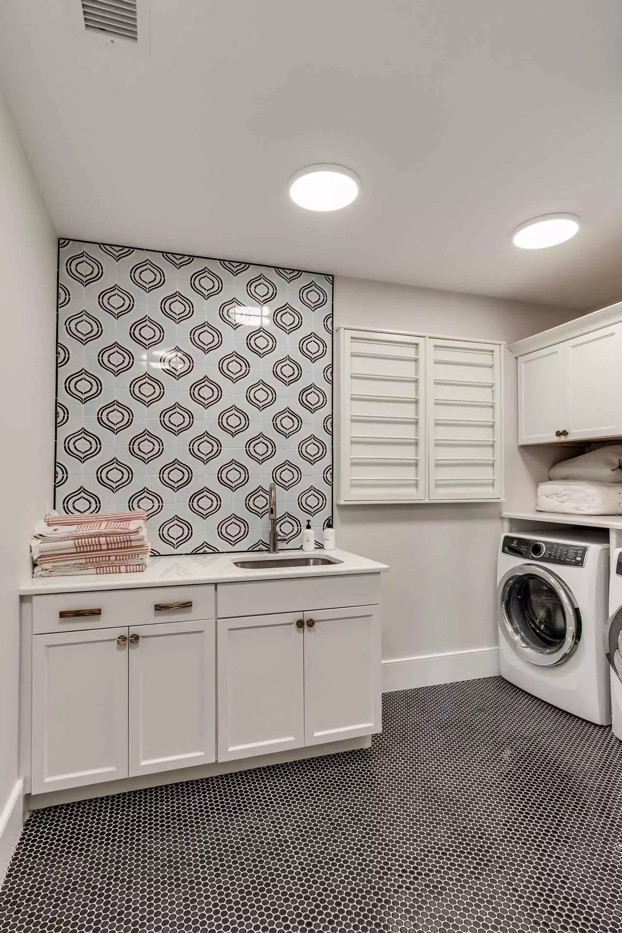 The elegant living room features a 60-inch linear gas fireplace and a wall of glass doors leading to an elevated pool, spa and travertine sunning deck. The bright chef’s kitchen has Cambria quartz countertops and stainless steel appliances. The adjoining dining room offers doors to the porch and an outdoor table.