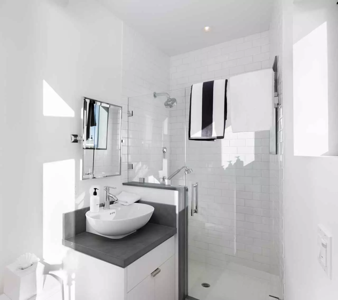 The primary suite is on the upper level, with a private balcony. The en suite includes a basalt and slate bath and shower area with a skylight, and a sleek double vanity. The upper level also offers a sunrise-to-sunset entertaining space: A covered area features a huge skylight, a bar counter with a sink and fridge, and multi-level decks for al fresco dining and lounging while enjoying the views.