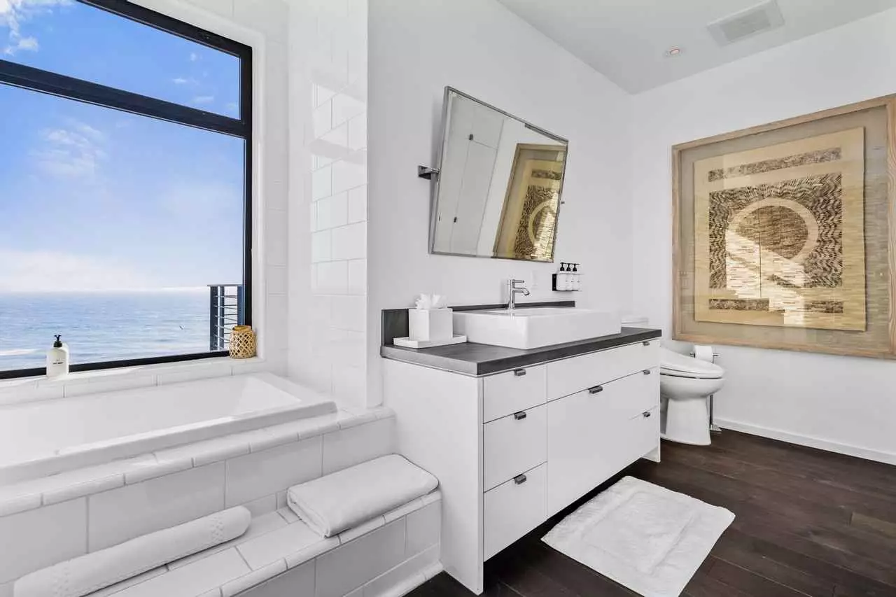 Each of the three bedrooms offer en suite bathrooms, deck access and more ocean views. One of the two main-level bedrooms includes an outdoor shower and hot tub.