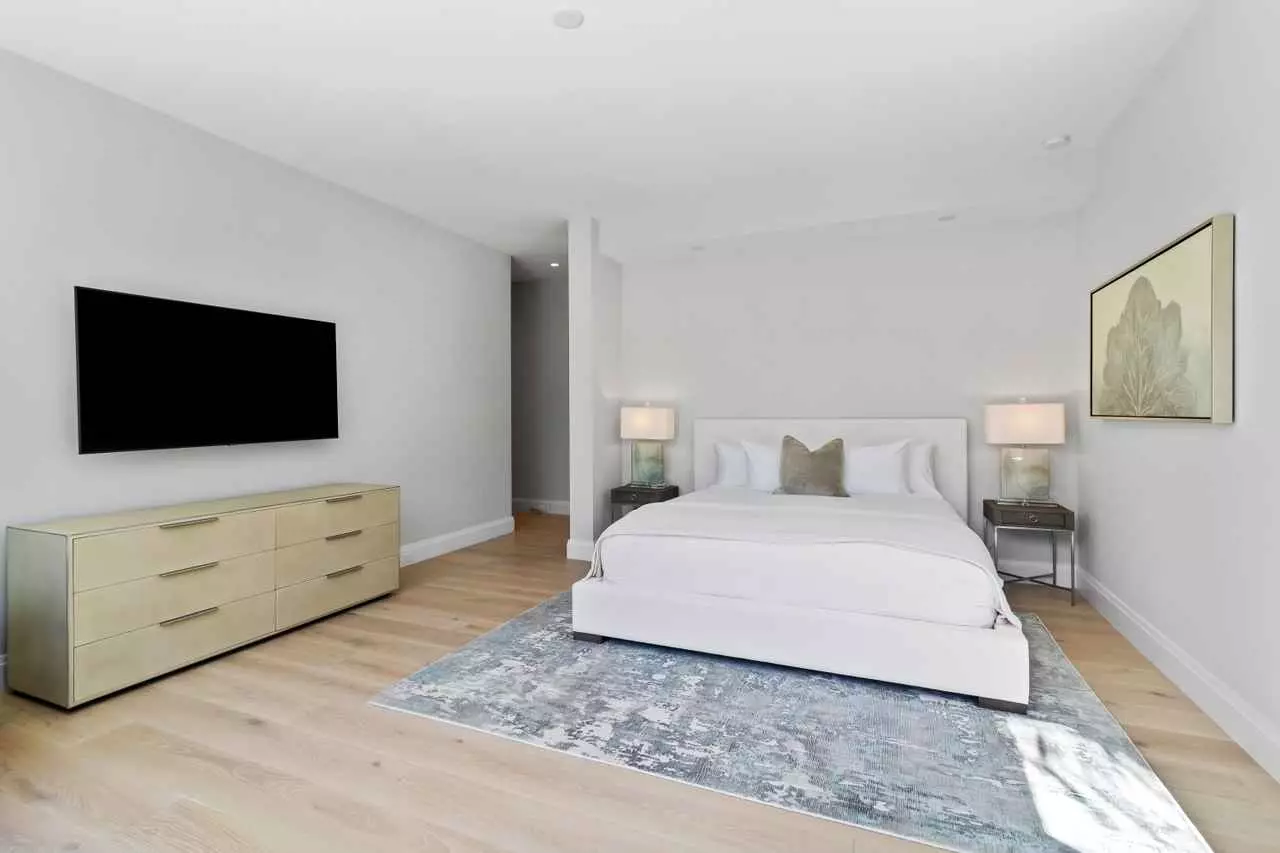 Natural light pours through floor-to-ceiling windows into the spacious open plan living space. The dream kitchen features custom cabinets, top-of-the-line appliances, an oversized island and a butler’s pantry.