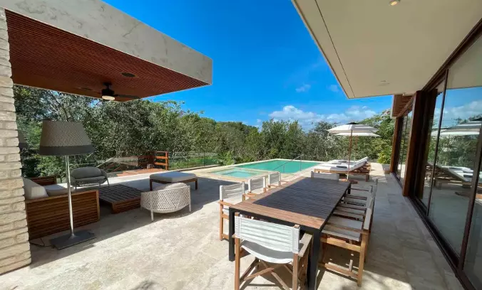 The Villa is located in front of the Mayakoba canals, in an area of 8,551 Sq. Ft; with 6,654 Sq. Ft of construction. Modern and luxurious spaces, high ceilings, windows that enhance the natural environment. On the ground floor it offers an elegant hall, with an elevator, half guest bathroom, spacious and open spaces, with luxury finishes: a double-height social area with large windows, thus privileging the spectacular views. In addition, a spacious dining room that connects to the luxurious kitchen that has a large bar, high-quality appliances, and a bar area. The impressive master bedroom, elegant, with large windows that open onto a terrace that connects you with nature and direct access to the pool, with an incredible spa-style bathroom, a jewel that manages to immerse yourself in the tropical jungle, with a tub, indoor and outside shower. It has a dressing room. Private pool facing the canal, open terraces, barbecue area, lounge chairs, integrating nature and landscapes as the main element of the experience, as well as a private dock.